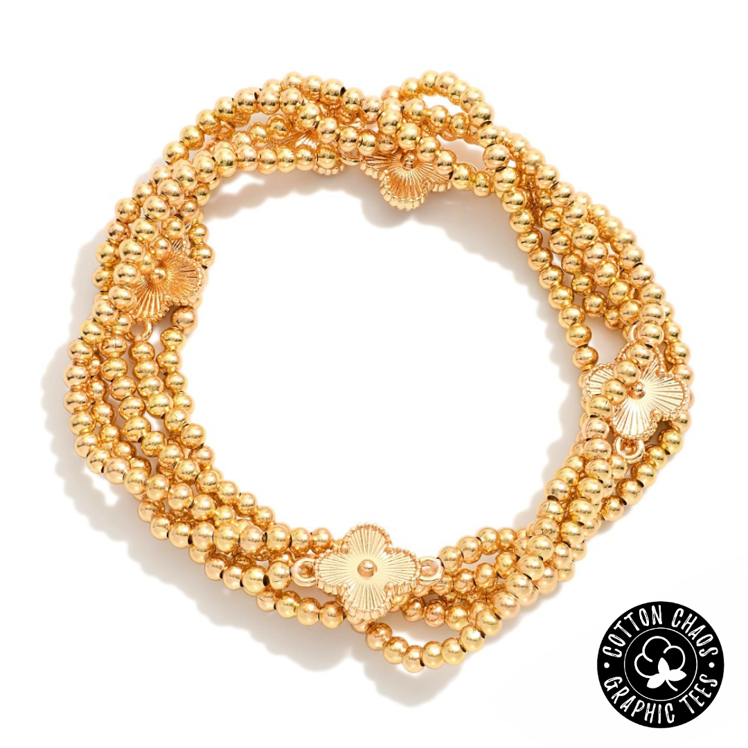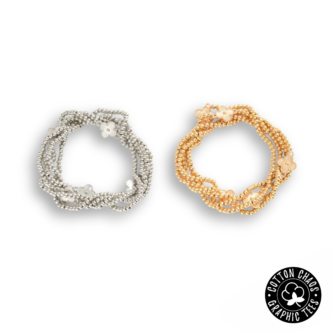 This set of five metal-tone beaded stretch bracelets features a mix of textured beads and a charming metal clover accent. Wear the full stack together for a bold layered look, or mix and match with your other favorites for effortless everyday style.