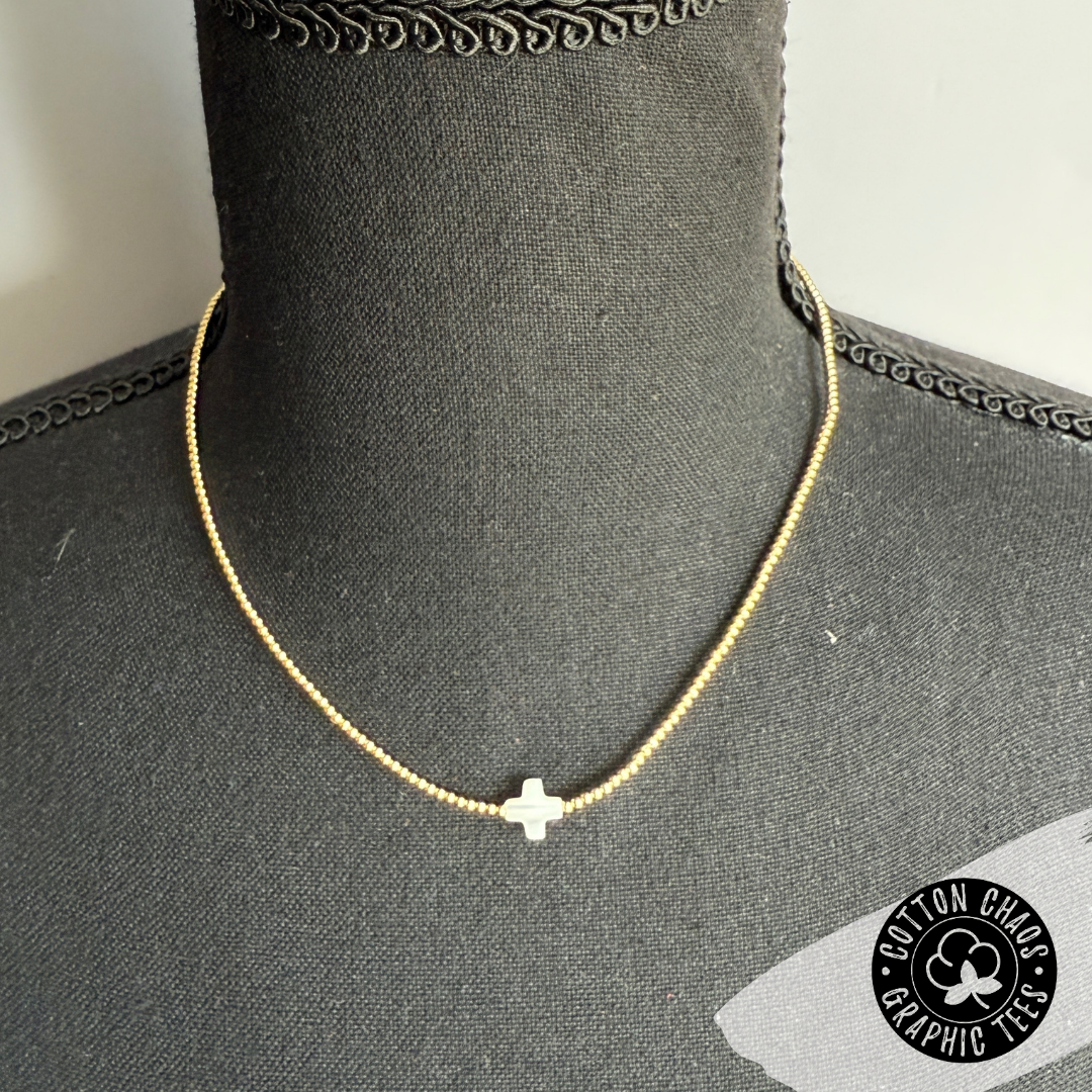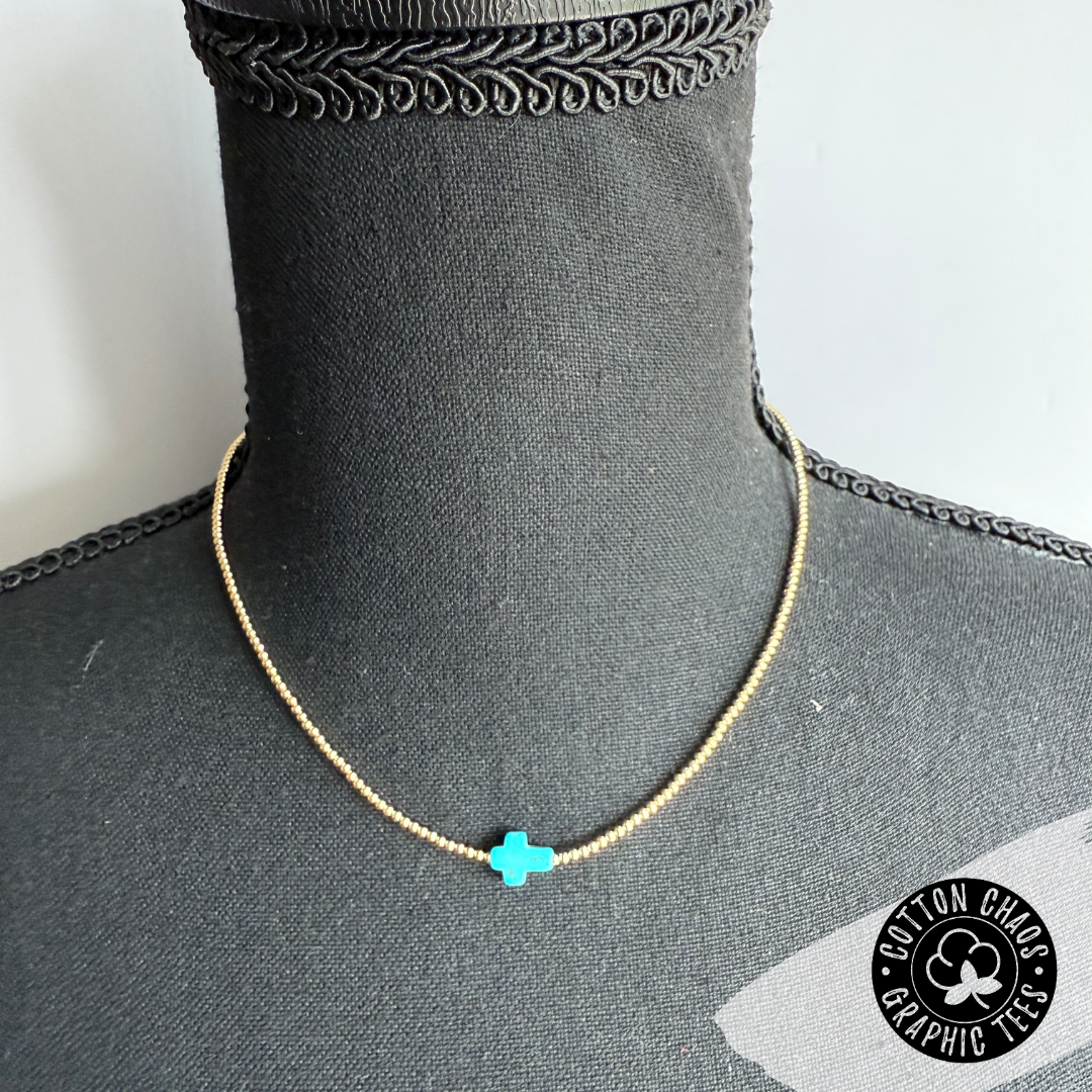 A delicate touch of faith and style all in one piece. This 16-inch beaded gold necklace features dainty 2mm gold beadsand a centered cross stone accent, available in your choice of white stone or turquoise stone.