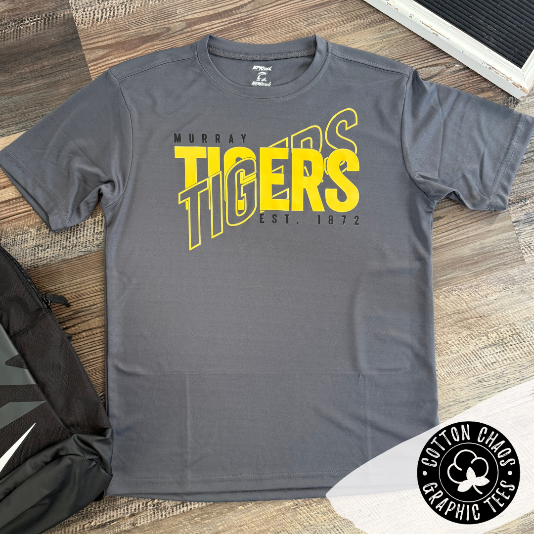 Classic, cool, and full of Tiger pride! This charcoal dry-fit tee features a striking black and gold Murray Tigers design that brings serious school spirit with a sporty edge. Lightweight and breathable with a unisex fit in youth to adult sizes, it's a must-have for cheering from the bleachers or reppin' Murray all day long.