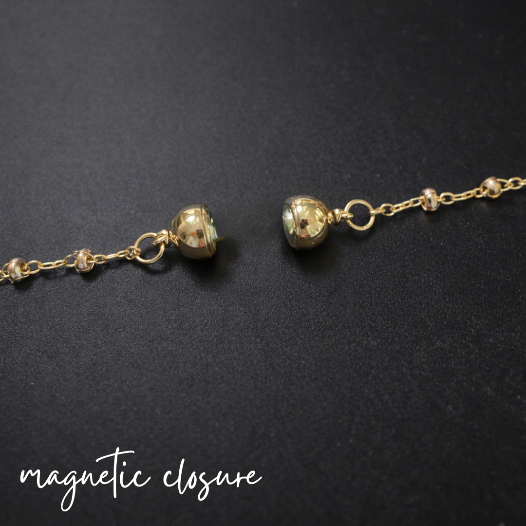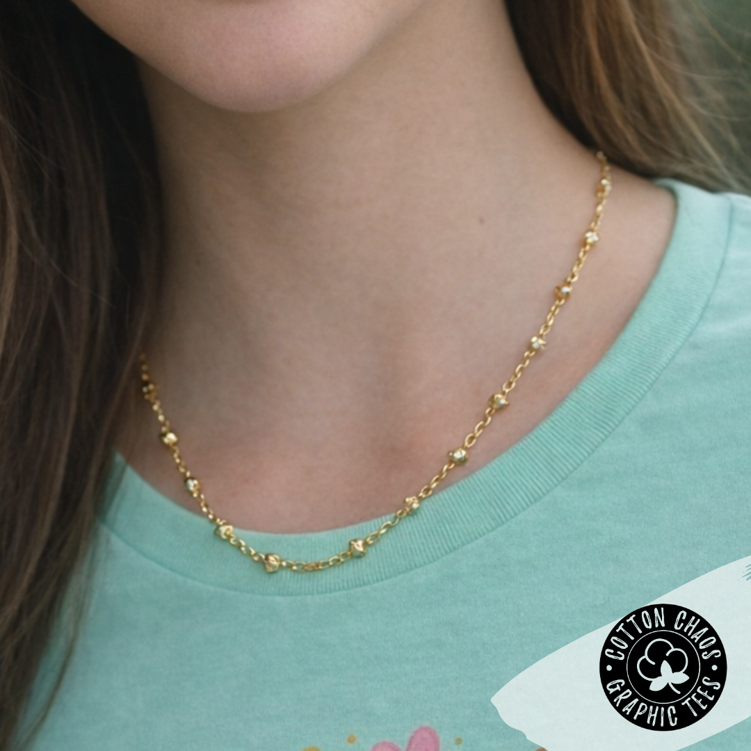 Made in gold with an 18” length, it’s finished with a strong, easy magnetic clasp that makes putting it on (and taking it off) a breeze. It looks amazing with graphic tees and is perfect for layering — especially with your Charmed necklacefor that signature Cotton Chaos stacked look.