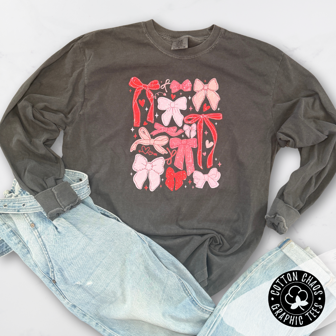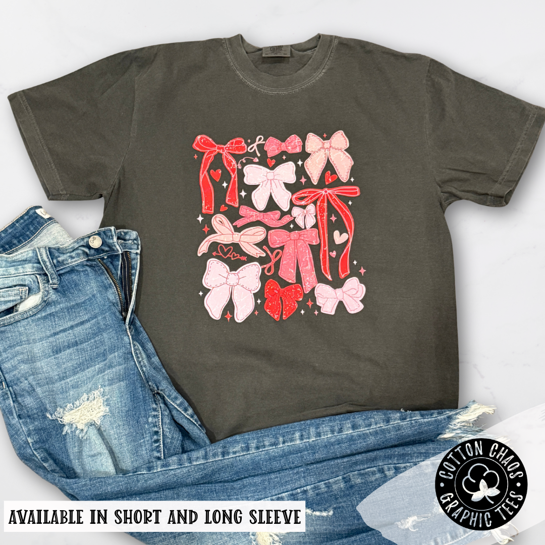 Sweet, bold, and full of love — our Bow My Valentine Tee is the perfect mix of trendy and festive! Available in both short sleeve and long sleeve Comfort Colors in the fan-favorite pepper shade, this tee features an adorable bow and heart design in all shades of red and pink.